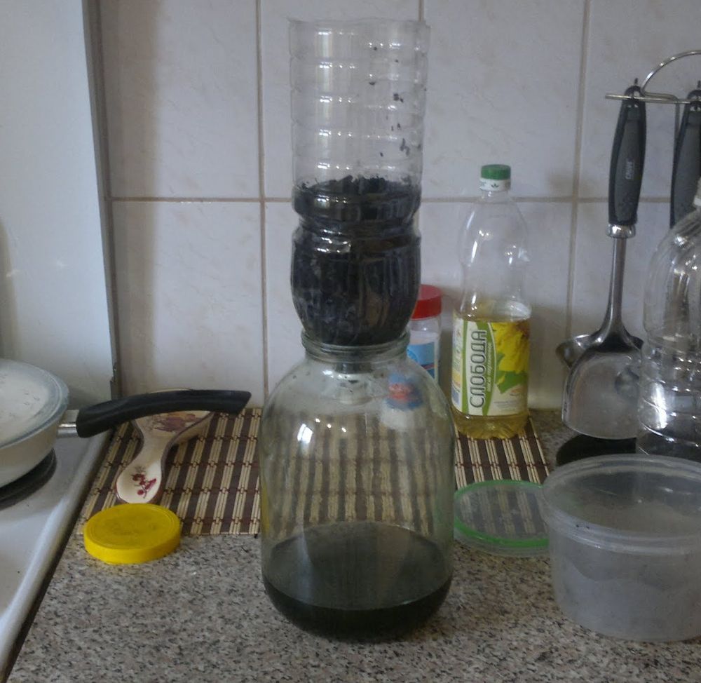 - С помощью силиконовой трубочки и принципа сообщающихся сосудов начинаем фильтрацию.