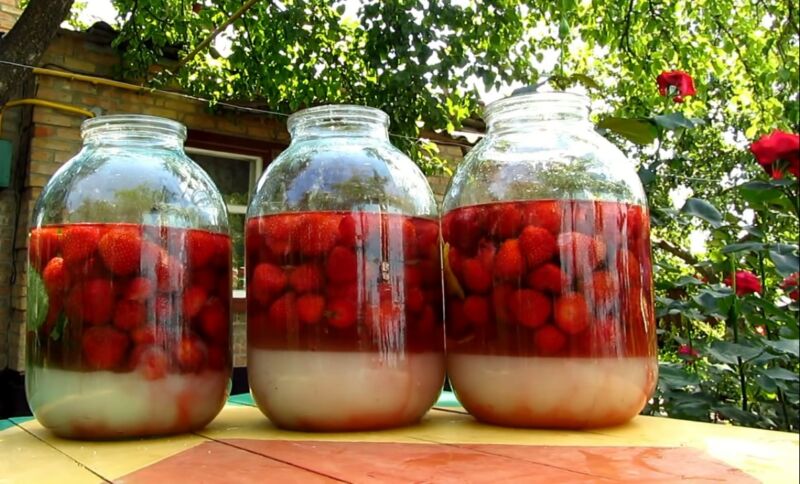 - Туда же выложить чистую, обсушенную клубнику без чашелистиков. Если ягода заморожена, размораживание не требуется. Жидкость должна покрывать плоды хотя бы на 1 см.