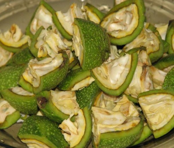 В незрелом орехе молочного созревания белая сердцевина еще не сформировалась. Кожура зеленая, мягкая, легко прокалывается иглой. Из лунки сочится сок, пачкая руки. Поверхность должна быть целой, без пятен. Именно из такого сырья готовят настойки. Сорванные зеленые грецкие орехи не имеют длительного срока хранения, поэтому их нужно обрабатывать быстро.