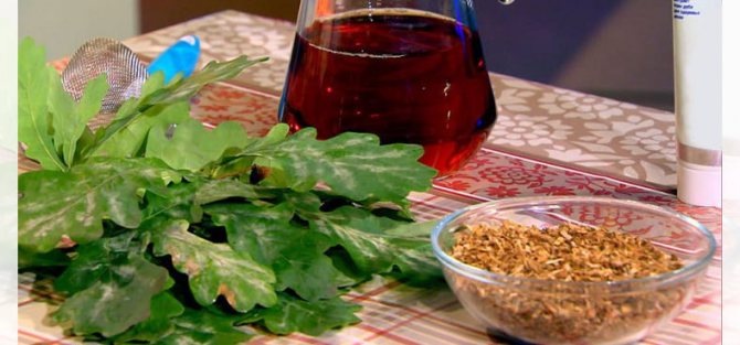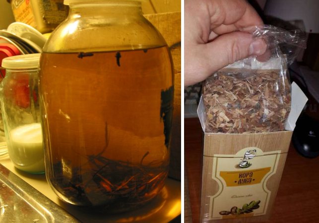 - Настой из коры дуба. Готовится на воде – 1 чайная ложка измельченного сырья залить 200 мл кипятка и настоять в течение 2 часов. После полного остывания – процедить.
