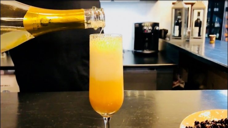 Блюда, сок и вино охлаждаются до льда. В стакан налейте сначала сок, затем игристое вино и аккуратно перемешайте ложкой. Наполняя стакан, необходимо учитывать, что появится пена.