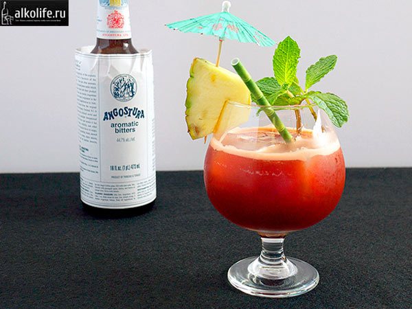 Коктейль “Red Bikini”: – 80 мл апельсинового сока; – 20 мл ангостуры; – 20 мл ликера из маракуйи; – 1 коктейльная вишня для украшения; – колотый лед. Смешайте сок, ликер и ангостуру в шейкере и вылейте в бокал для мартини. Украсить вишенкой.