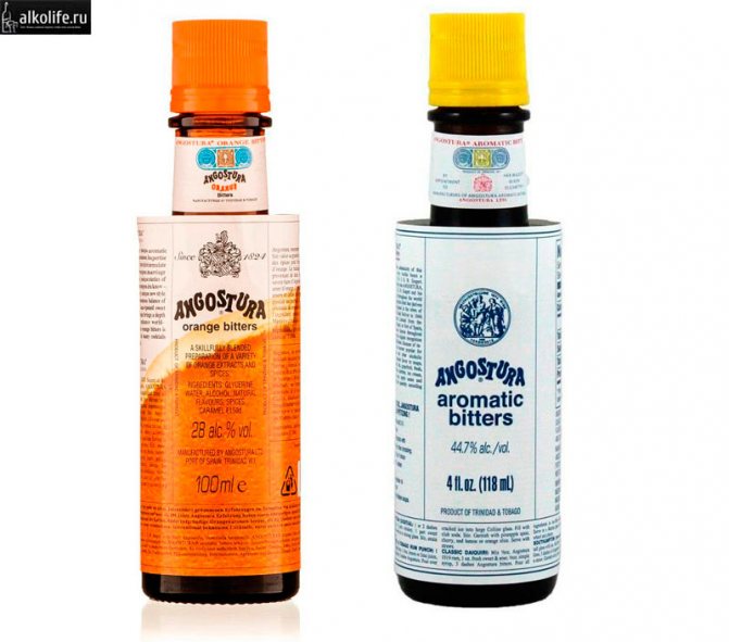 - Биттер Ангостура – этот красновато-коричневый биттер чаще всего используется в барах. Продукт на основе рома и горечавки, он был изобретен в 1824 году в городе Ангостура, Венесуэла, в настоящее время основной производитель находится на острове Тринидад. Его крепость составляет 44,7 %.
