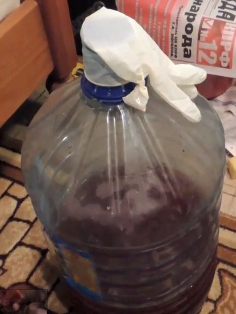 - На флакон можно или можно накинуть пломбу или резиновую перчатку с отверстием на одном из пальцев. Оставьте напиток в теплом месте, чтобы он снова забродил. Когда надутая перчатка отваливается и пузырьки газа перестают выходить из гидрозатвора, это означает, что вино заиграло. На дне будет хорошо виден осадок. Теперь нужно слить напиток в любую чистую емкость с помощью тонкой силиконовой трубки, чтобы осадок остался на дне.