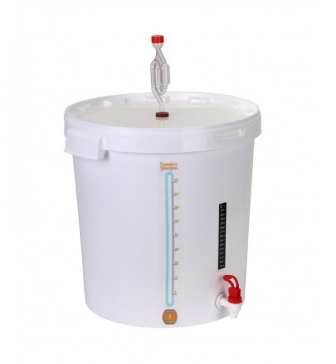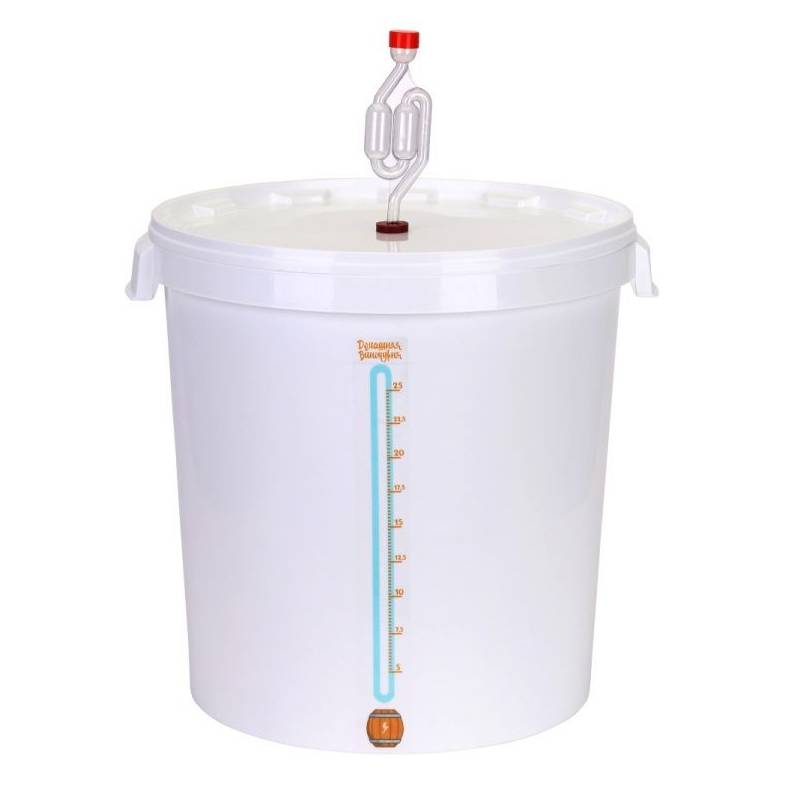 Основная проблема любого начинающего винодела – найти подходящую тару, из которой можно будет производить сусло. Если говорить о небольших объемах, используйте три-четыре рулона, подойдет пара трехлитровых банок. Но если нужно заквасить большее количество основы, например, для вина из ягод, которыми полон сад, то такой объем не очень подходит. Использование кастрюль и емкостей невозможно из-за неплотных крышек. Решить сложившуюся ситуацию призвана пластиковая емкость объемом 30 литров, крышка которой снабжена силиконовой крышкой. Кроме того, в комплекте поставки уже есть гидрозатвор, поэтому после покупки модели вы можете сразу приступить к изготовлению вина.