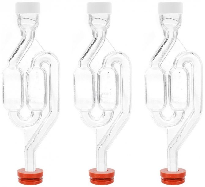 Эти конструкции представляют собой изогнутые стеклянные трубки. Еще можно сказать: эстетично выглядят. Их вставляют в отверстие в пробке; для уплотнения внизу трубки имеется резиновая прокладка.