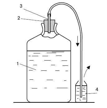 Классический прибор состоит из гибкой трубки (3), крышки (2) и стеклянного сосуда (4). Принцип его работы заключается в том, что при повышении давления в резервуаре для сусла (1) избыточный газ по трубам сбрасывается в резервуар, заполненный жидкостью, что предотвращает попадание кислорода в резервуар для сусла.
