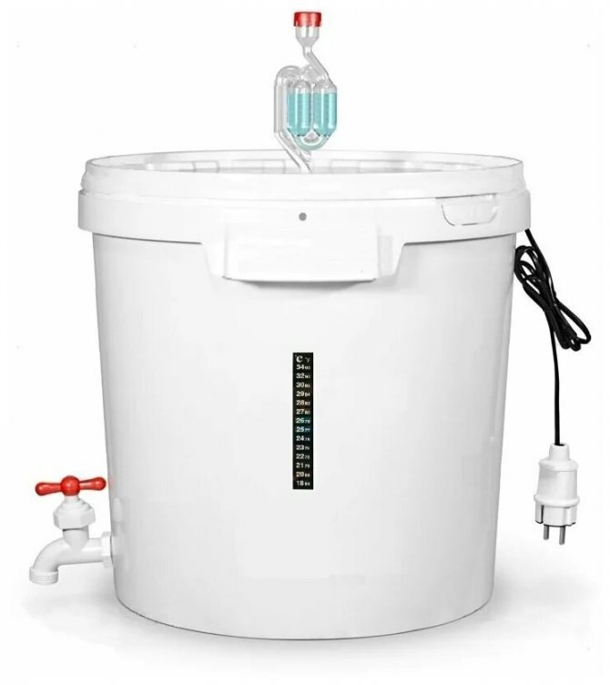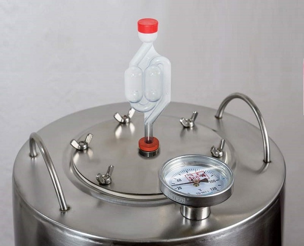 Оценка качественных сантехнических блоков дополнена комплексом, позволяющим полностью исключить необходимость каких-либо дополнительных затрат на первом этапе производства самогона. Пластиковая емкость из пищевого синтетического материала на тридцать литров, двухкамерный гидрозатвор, сливной кран, градусник и маломощный нагревательный элемент (аквариум). Данное оборудование позволяет поддерживать температуру сусла в течение желаемого периода времени. Это необходимо при производстве сложных алкогольных напитков или зимой, когда температура окружающей среды опускается до минимума. Найденный здесь клапан не пробкового типа, а более технологичный. Отсюда и довольно высокая стоимость представленной новинки.