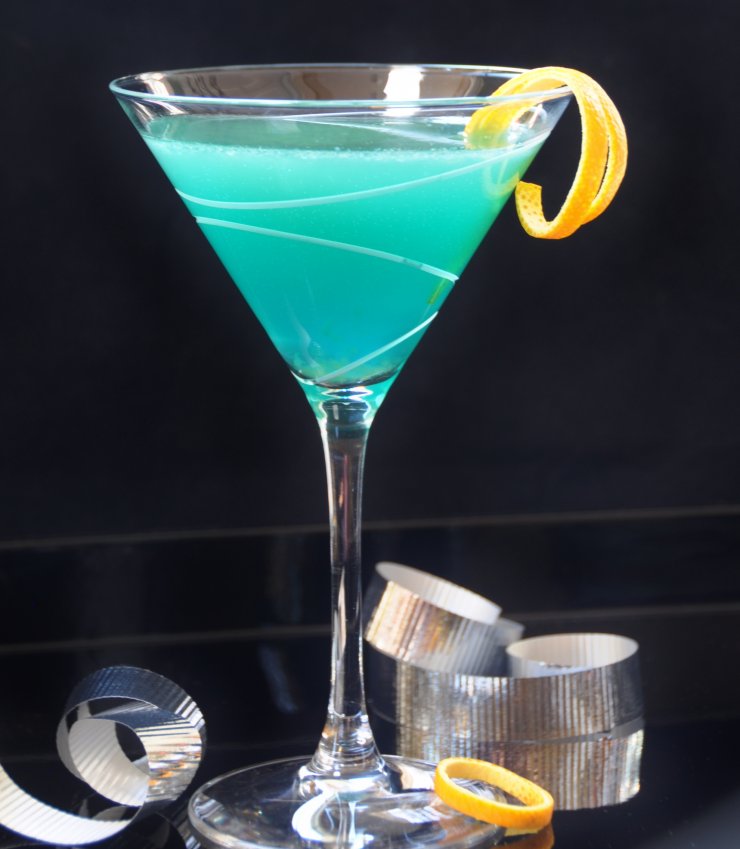 Состав: джин, свежевыжатый апельсиновый сок (без мякоти), Блю Кюрасао, сухой мартини, лед, долька лайма.