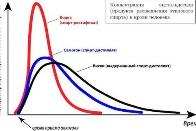 Если фюзеляж присутствует в небольших количествах, это тоже может дать положительный эффект: замедление окисления спирта до ацетальдегида, который серьезно влияет на печень и другие внутренние органы. Как видно из приведенной ниже таблицы, дистиллятные продукты разлагаются медленнее.
