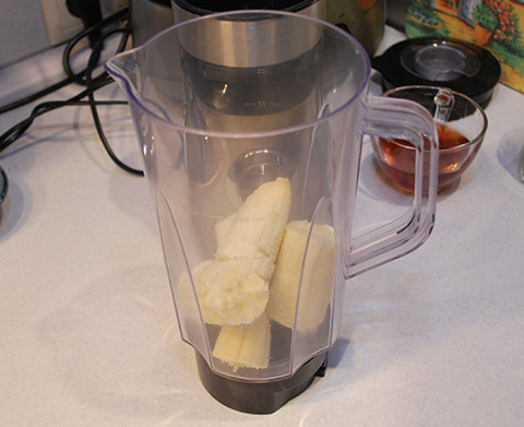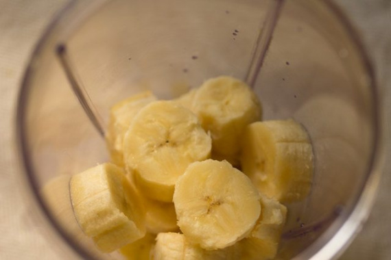 - Бананы нарезать небольшими кусочками и переложить в блендер.