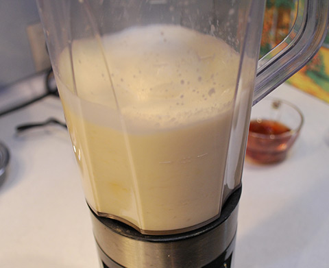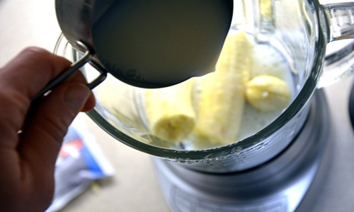 - Молоко аккуратно вливается тонкой струйкой. Чтобы консистенция напитка была максимально гладкой, молоко и банан должны быть одной температуры. А поскольку бананы нельзя хранить в холодильнике, молоко лучше покупать заранее.