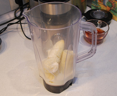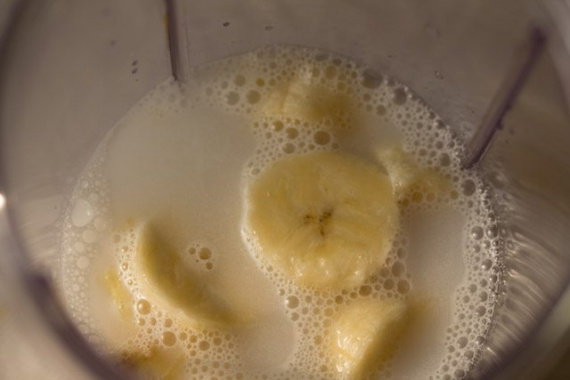- Очистите банан, нарежьте кружочками и положите в чашу блендера.