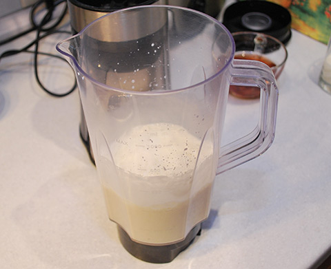 - В чашу помещается блендер, после чего на минимальной скорости ингредиенты взбивают 3-5 минут до появления густой пены.