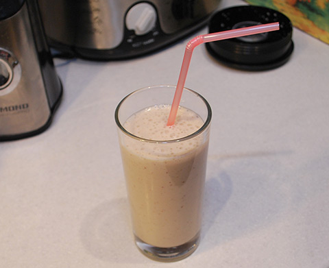 - Готовый напиток будет густым. При желании можно использовать не 1, а 1,5 плода, так вкус будет более «банановым».