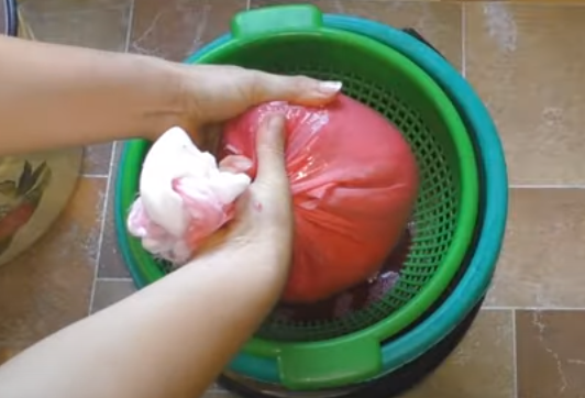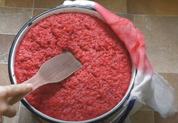 5. Увидев уже явные признаки брожения (сусло шипит, издает специфический кислотный запах, сока много и мякоть хорошо отделяется) процеживают всю массу. Пирог выдавливается через несколько слоев марли.