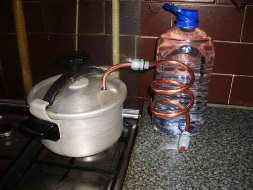 - Поставьте перегонный куб на огонь и налейте воду в змеевик.