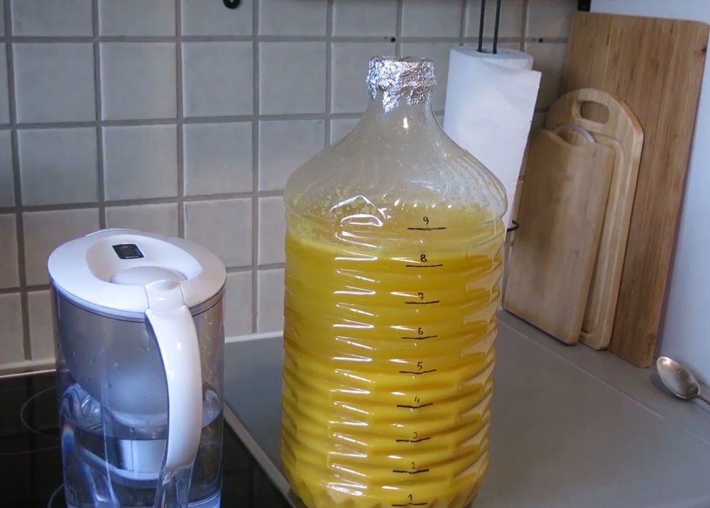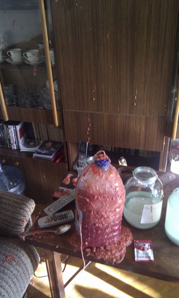 История из жизни: поставил мужик 5 литров апельсиновой браги в квартире под гидрозатвор. Через сутки пробку выбило, а мезга с жидкость разлетелась по всей комнате (стены, потолок).