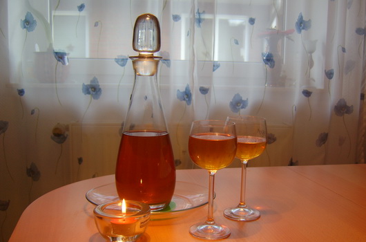 После этого смешайте сок со спиртом, перелейте в бутылку и добавьте еще сахара. Бутылку оставляем в прохладном месте на 5-6 дней для урегулирования помутнения и растворения сахара, затем аккуратно снимаем его с осадка.