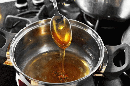 - В сотейнике смешайте: 250 г меда, 200 мл воды, 1 палочку корицы, 2 гвоздики, 1 кардамон, 20 г мяты, 5 г перца и 10 г пищевой соды.