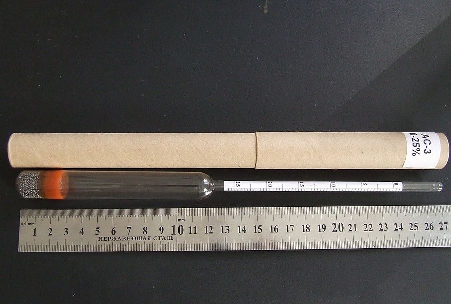 - Спиртометр — устройство для измерения крепости в напитках, содержащих только спирт и воду. В браге много лишних примесей, поэтому он нам не подойдёт.