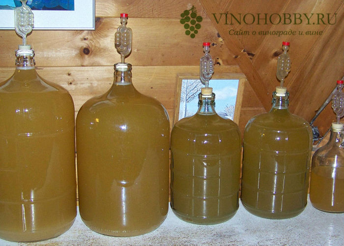 Через 3-4 дня активного брожения отфильтровать мезгу, стараясь не сдвинуть осадок, перелить в стеклянную бутыль, наполняя ее не более чем на 3/4. Поставьте гидрозатвор или наденьте резиновую перчатку с дырочкой на пальце. Убрать вино для брожения при температуре 18-24 градусов, защищая цилиндры от попадания прямых солнечных лучей.