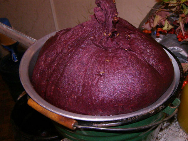 По истечении указанного времени слить сброженный сок в емкость для брожения, мякоть отжать с помощью пресса. Сок не должен превышать объем емкости более чем на 2/3, иначе при сильном брожении есть риск просыпания сусла.